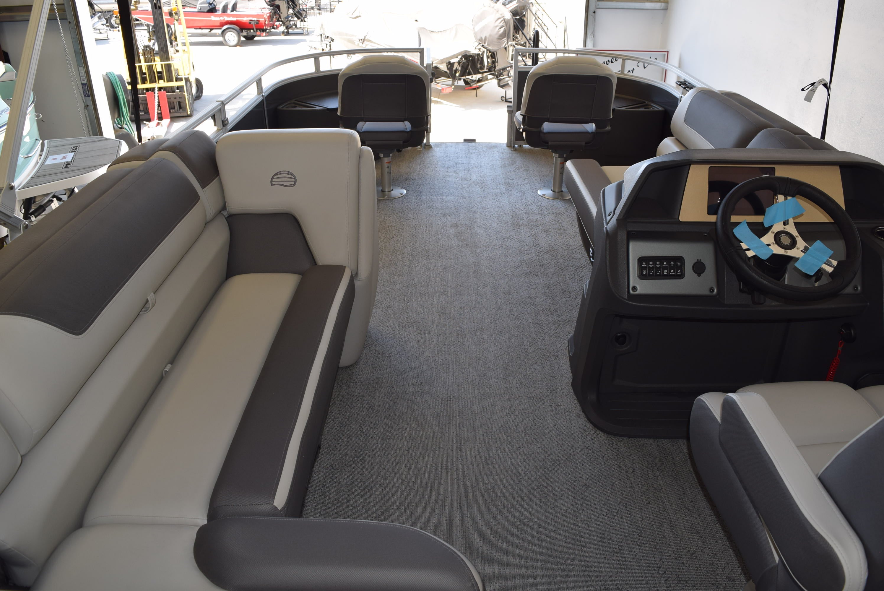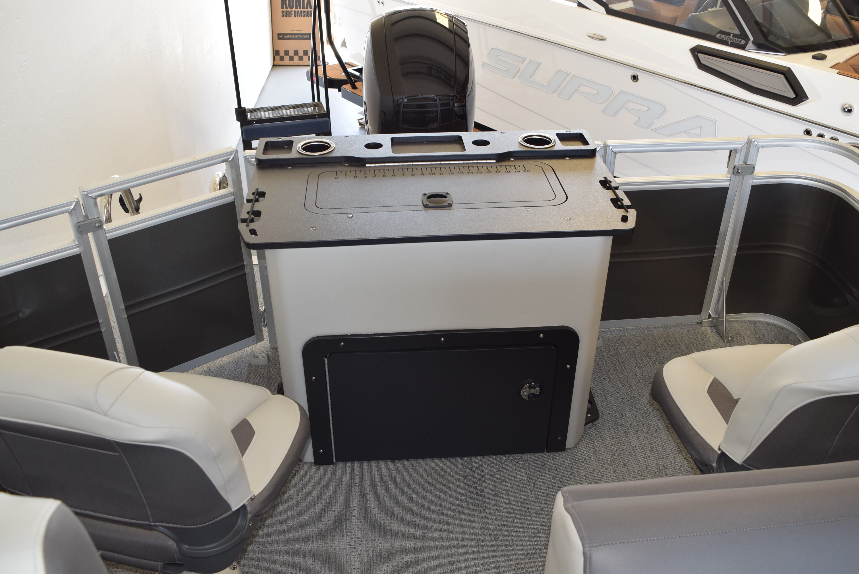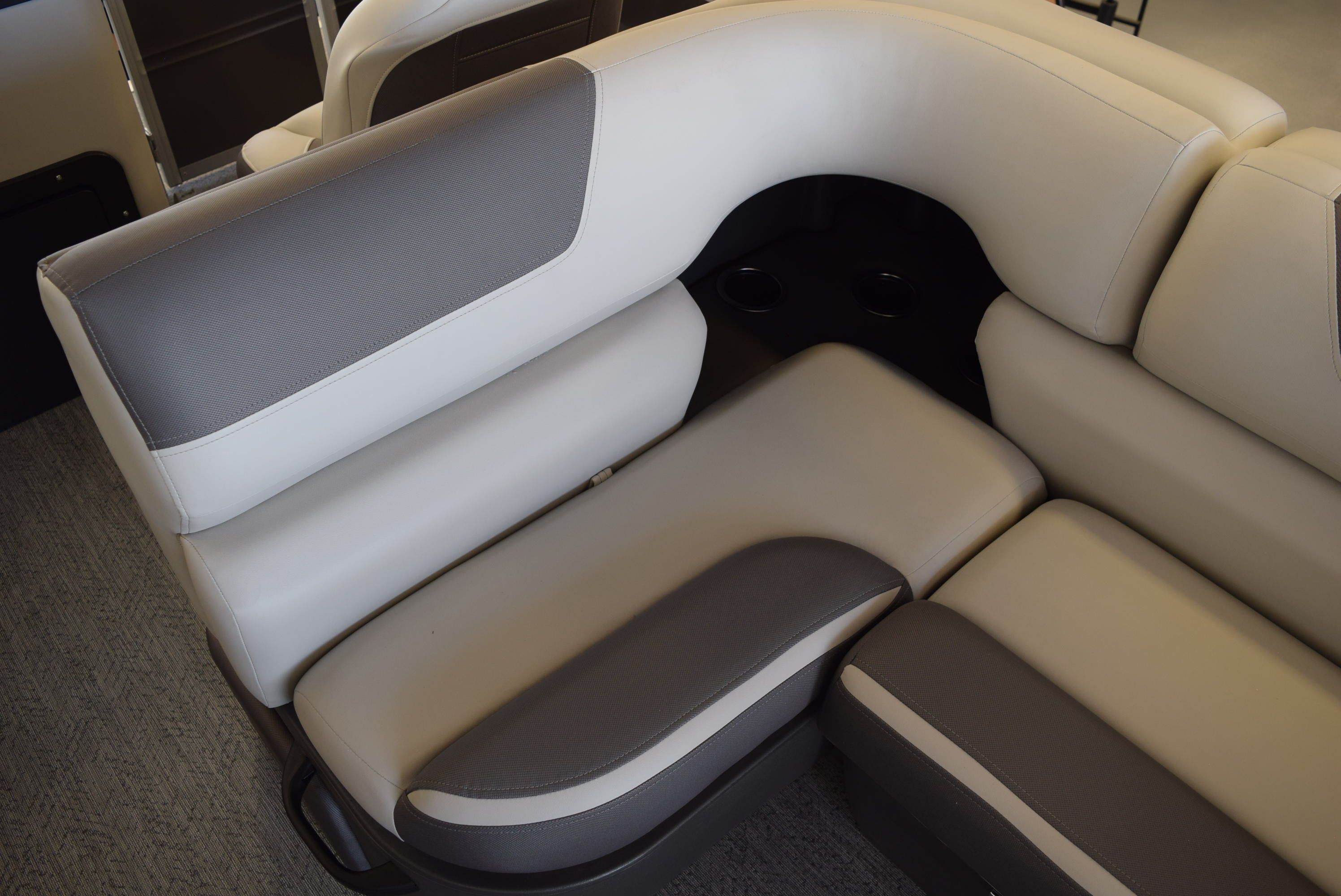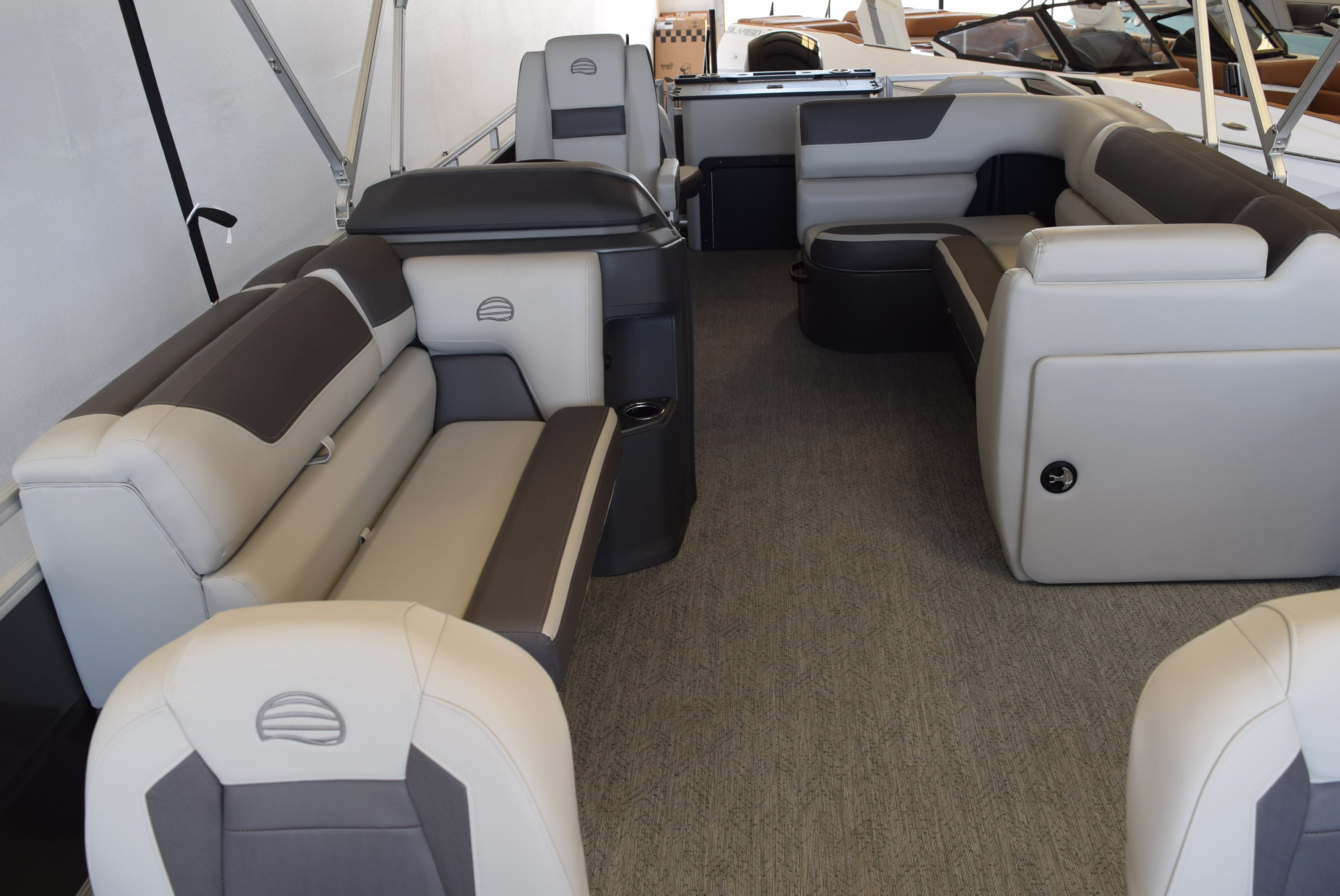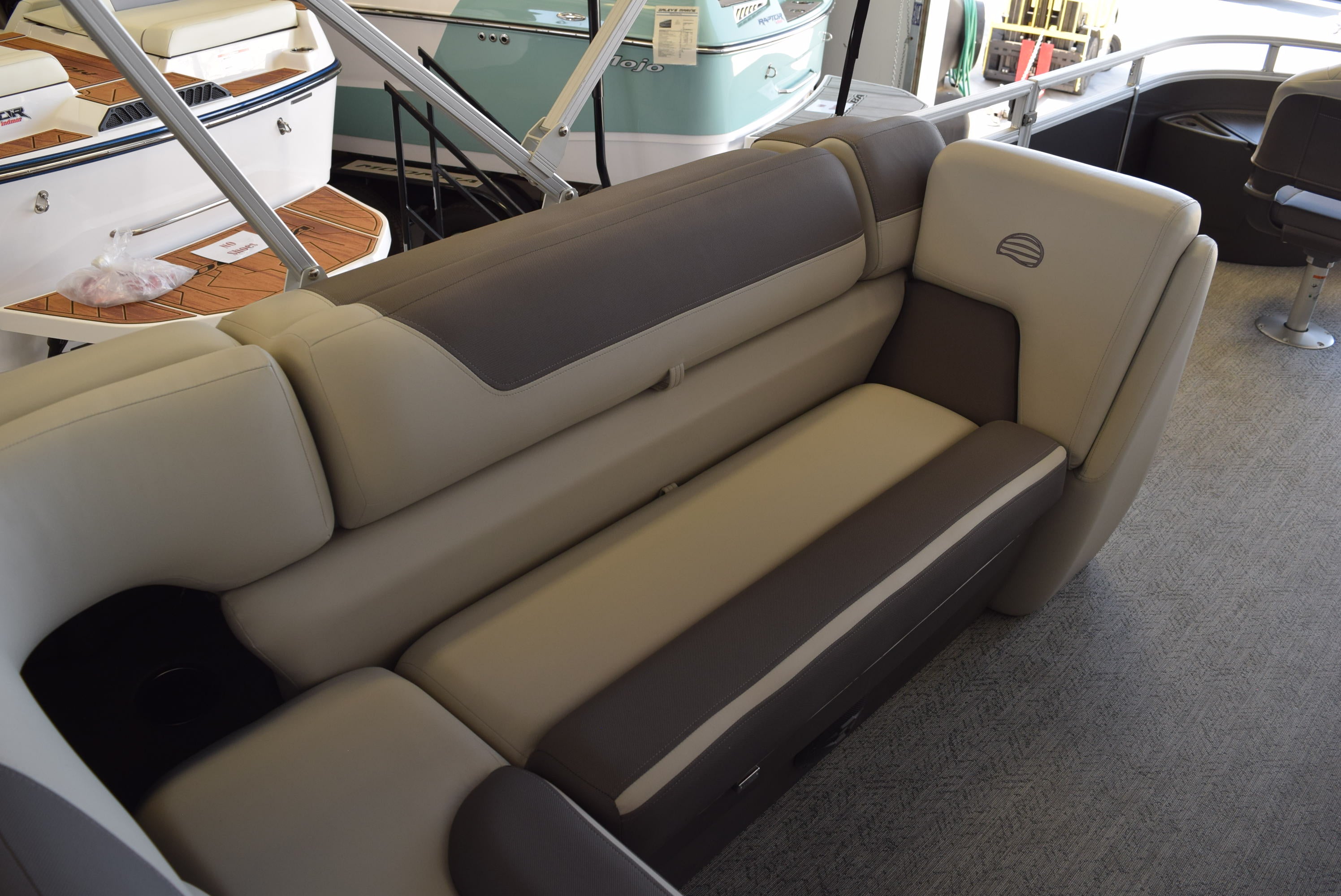 You can keep your other supplies in the hidden under-seat and seat-back STOW MORE™ compartments. The 2026 model adds improved storage built right into the lounge's backrest that includes extra cupholders and space for more gear. Between the removable table, the 10' bimini top, the brand-new boarding ladder with wider steps, and the Bluetooth®-capable stereo, your lake days are covered.