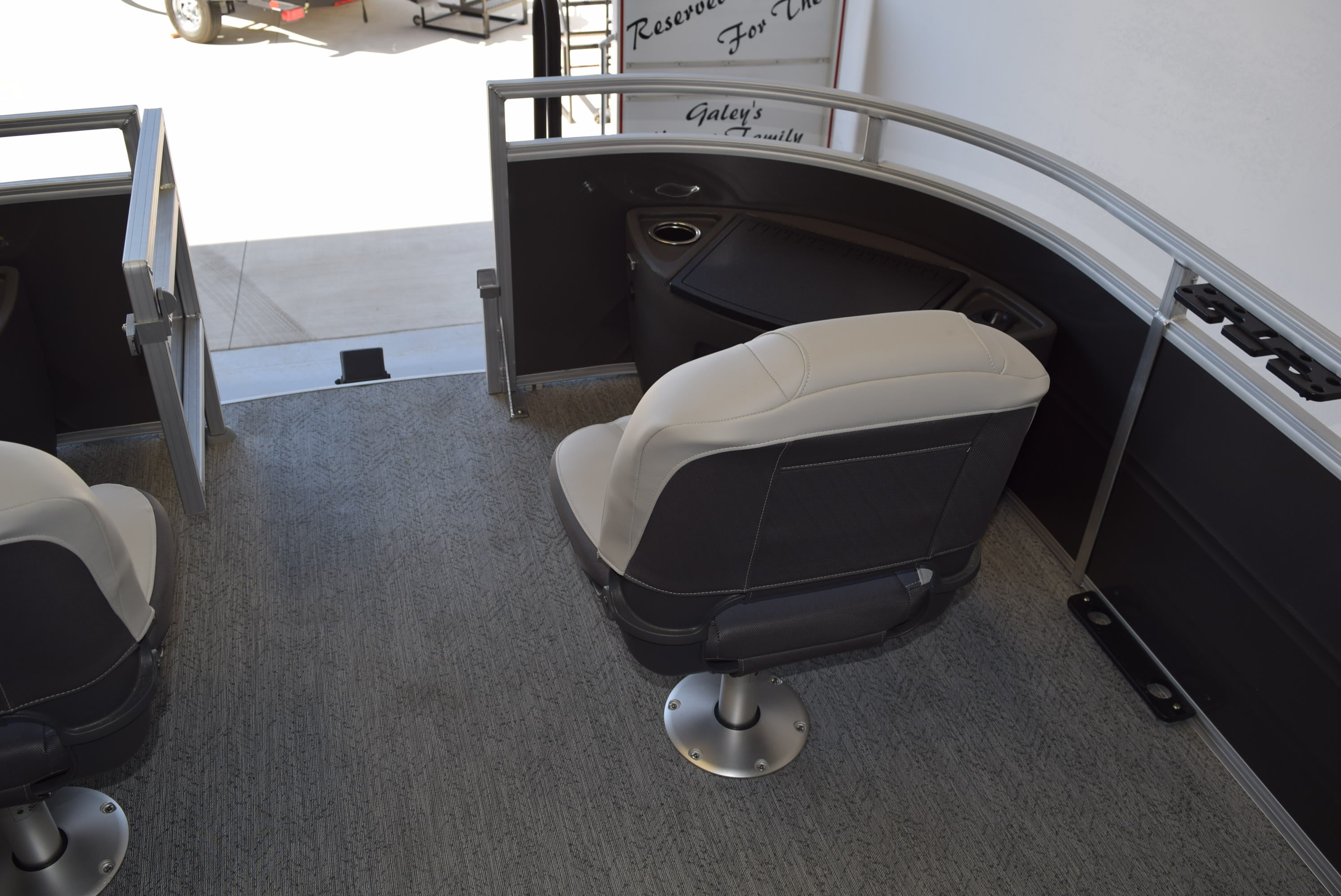 The FISHIN’ BARGE 22 DLX’s long list of features begins with 32 gallons of livewell capacity spread out between the fore and aft fishing decks. Both of those decks sport two foldable fishing chairs with pedestal bases. Their rail-mounted rod and tool holders—as well as the aft lockable rod box—keep everything you need at hand.