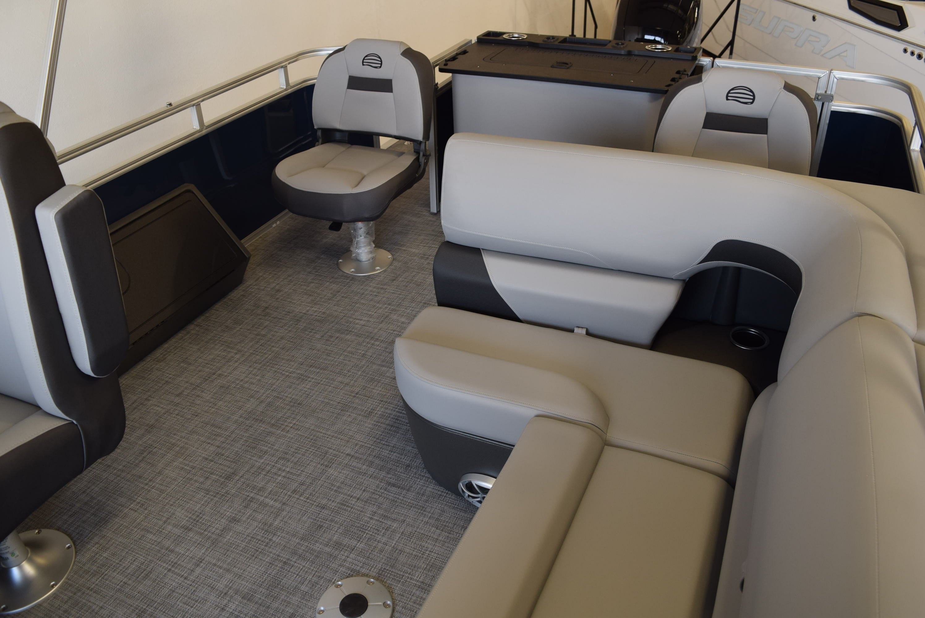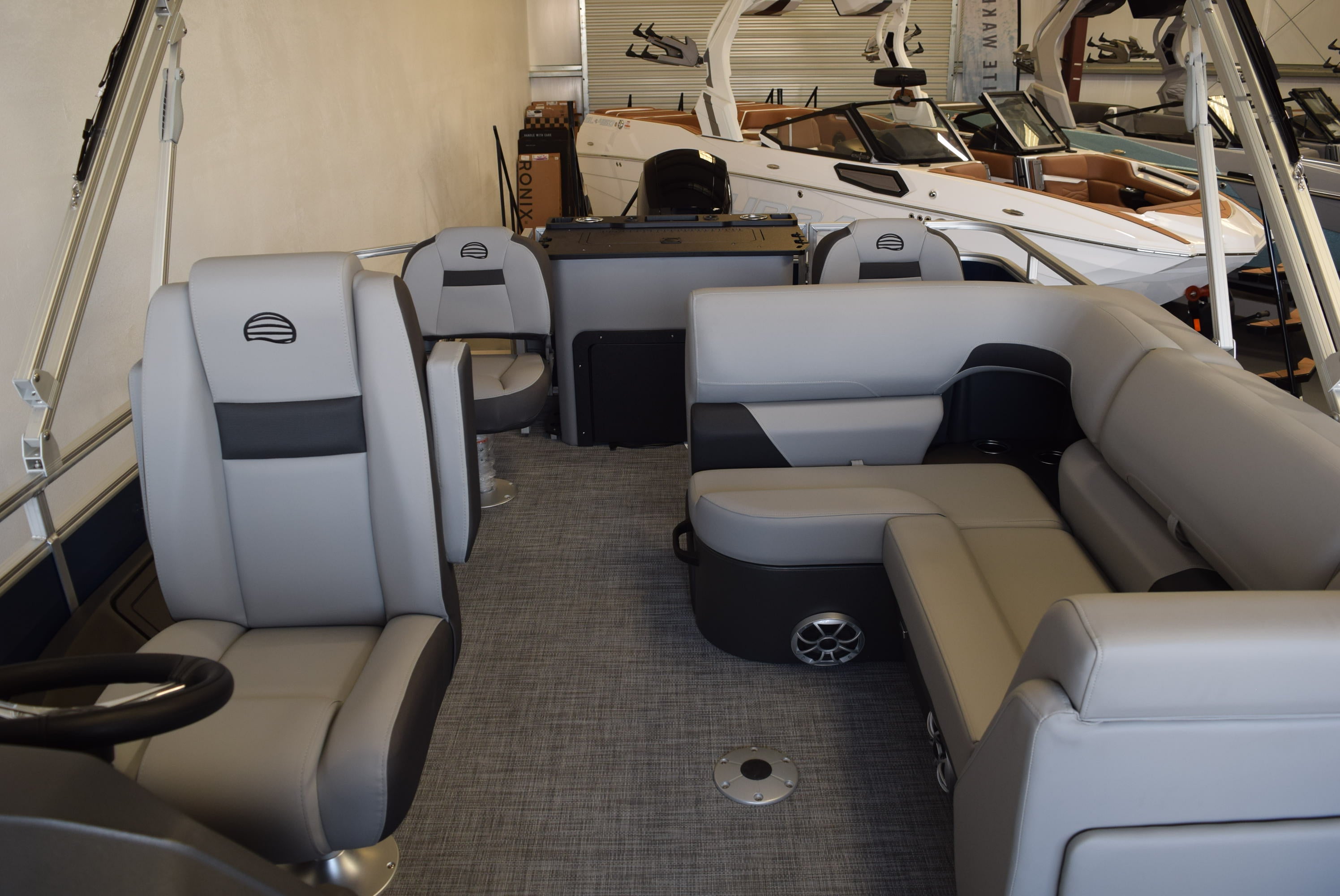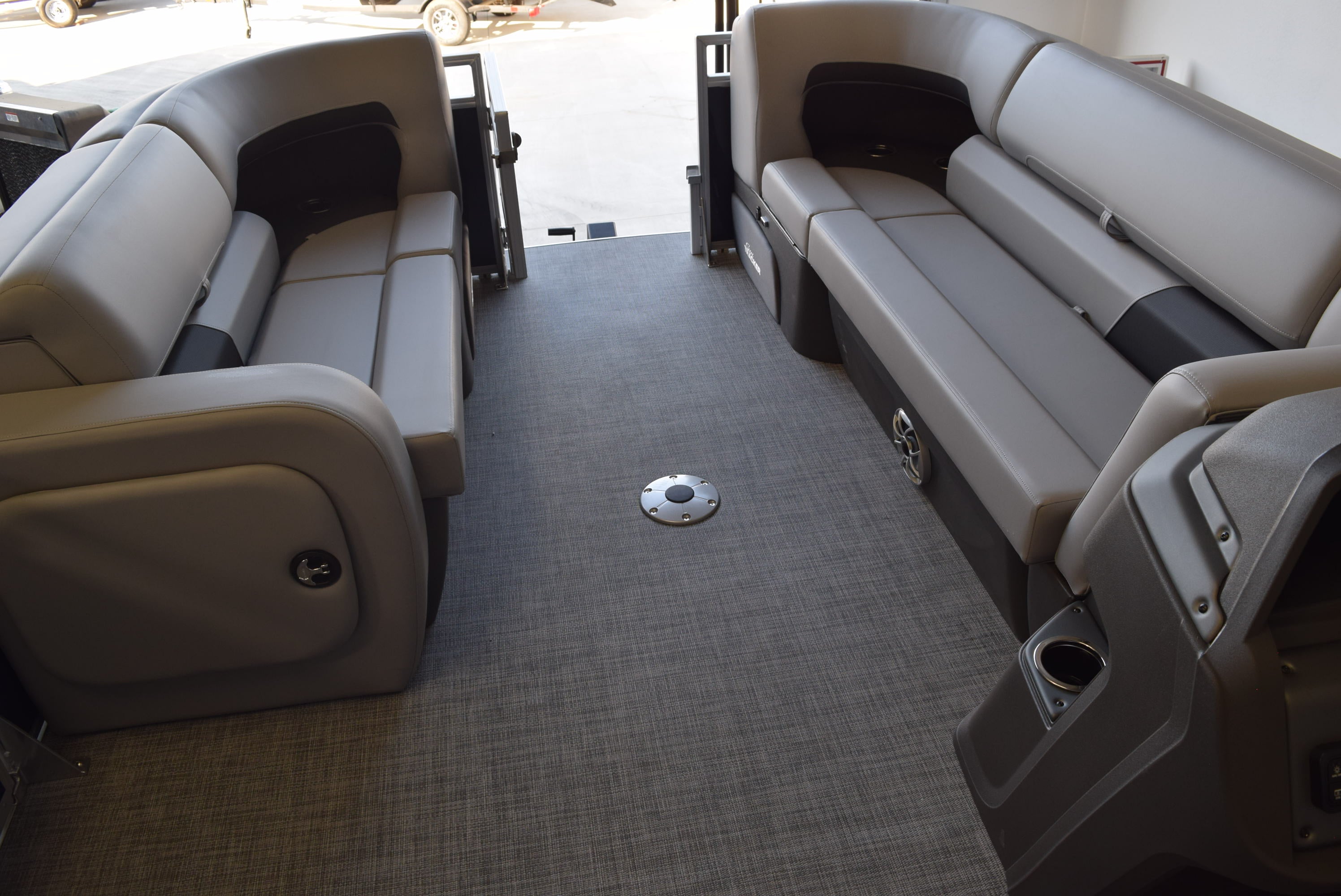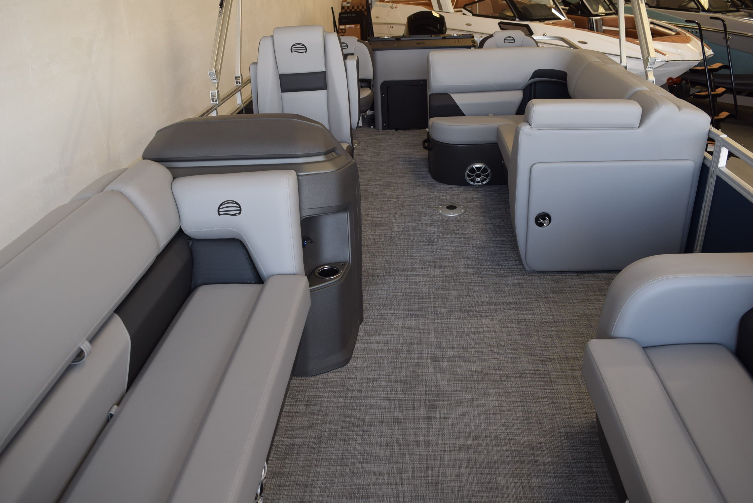 This is the fishing pontoon the whole family can enjoy. This SPORTFISH introduces a third lounge and pushes back the second casting chair to the aft casting deck. The 22 DLX also introduces a lockable rod box that can fit up to six rods. The 2026 model year brings some fine-tuned changes, including a wider boarding ladder, open storage spaces with cupholders built into the seatbacks, and more.